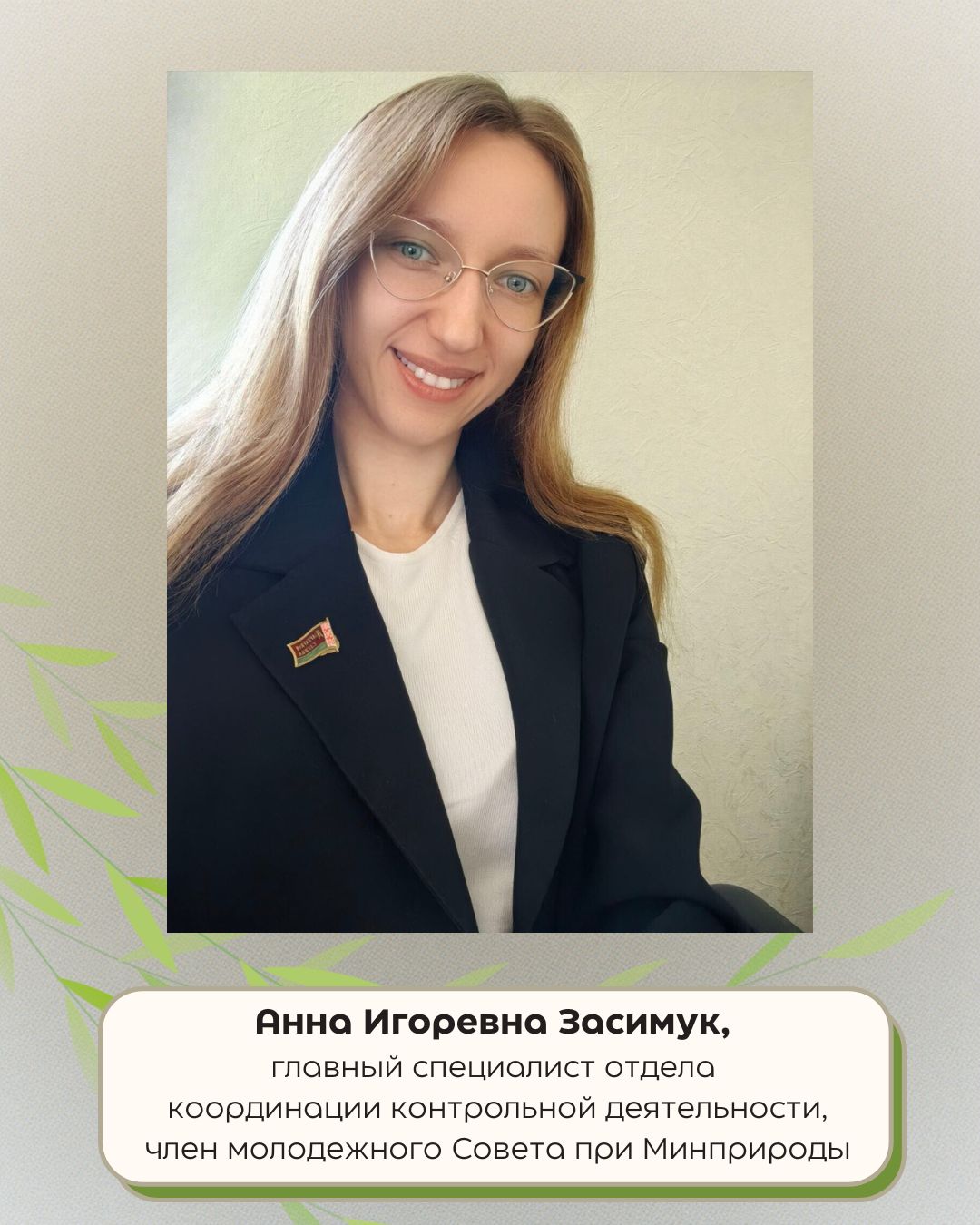 Брестский областной комитет природных ресурсов и охраны окружающей среды в молодежном Совете представляет Анна Игоревна Засимук, главный специалист отдела координации контрольной деятельности.