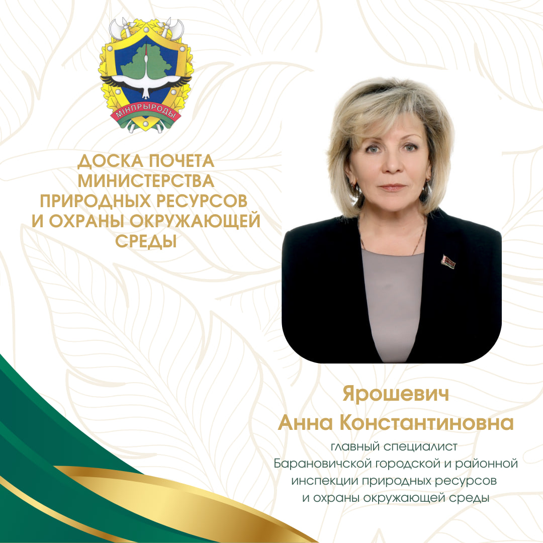 Ярошевич Анна Константиновна, главный специалист Барановичской городской и районной инспекции природных ресурсов и охраны окружающей среды по результатам работы за 2025 год удостоена занесения на Доску почёта Министерства природных ресурсов и охраны окружающей среды Республики Беларусь.